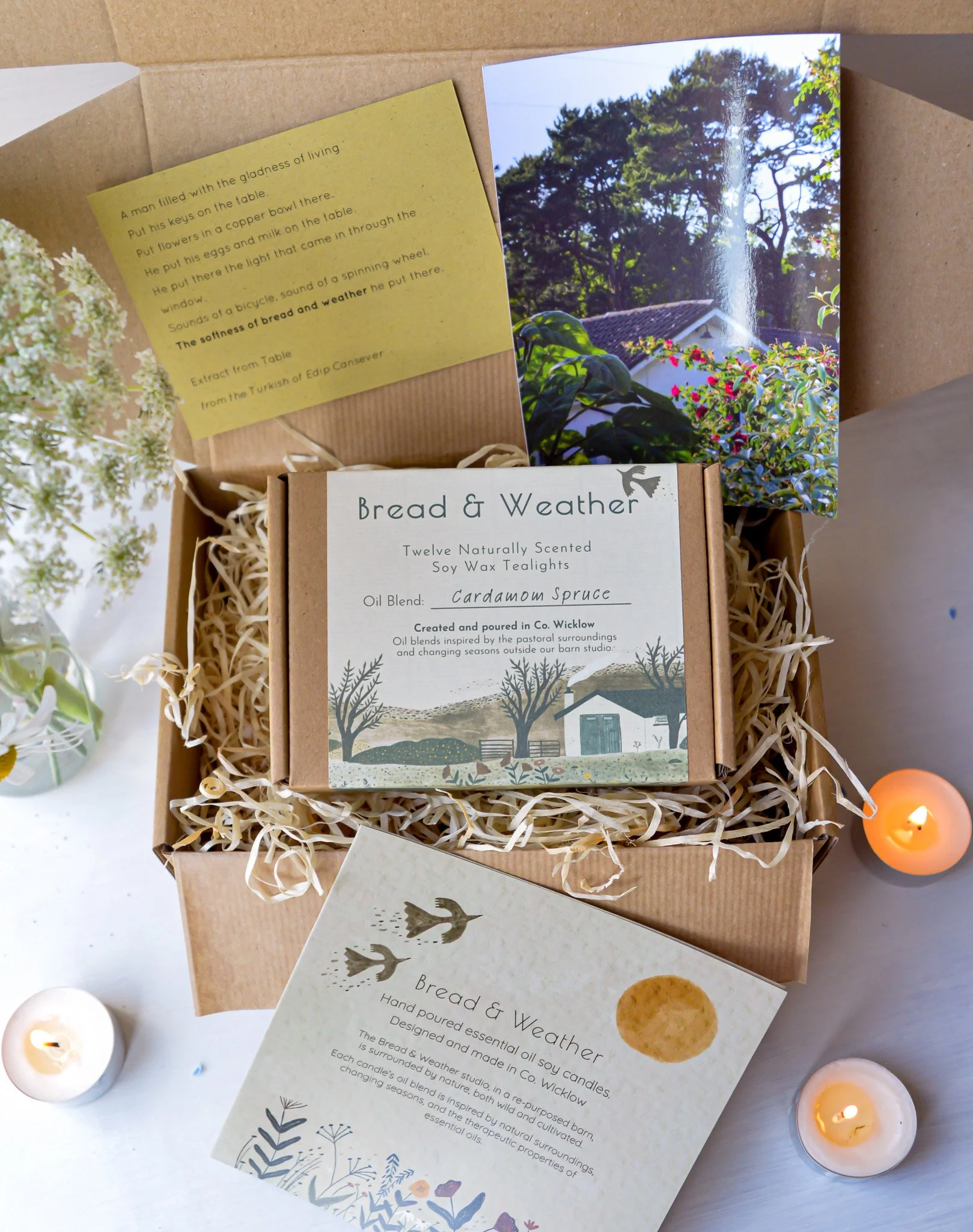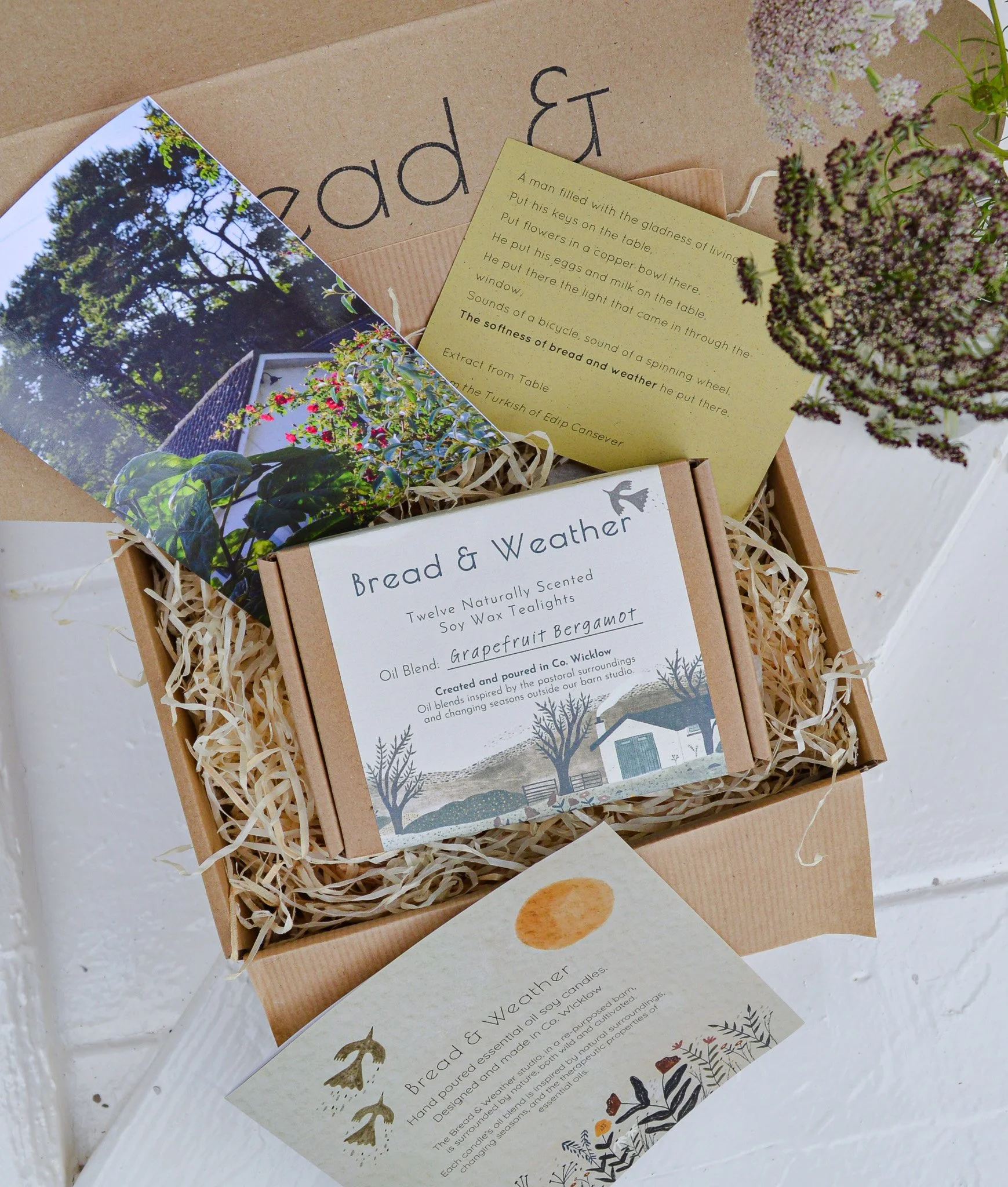 Each box also includes a small illustrated guide to the essential oils used in our studio, a printed excerpt from the poem Table that inspired the name Bread & Weather, and a picture postcard featuring the barn where your gift was made. Add a gift message or leave it blank for your own handwriting.