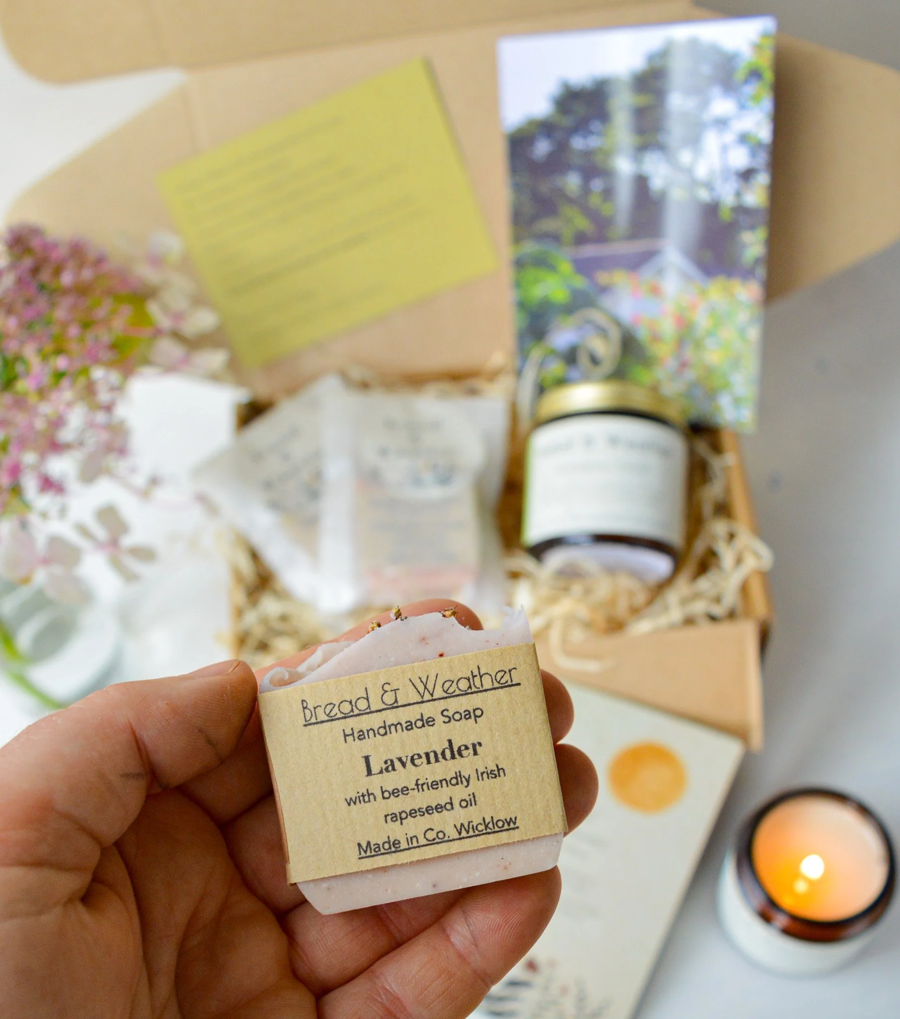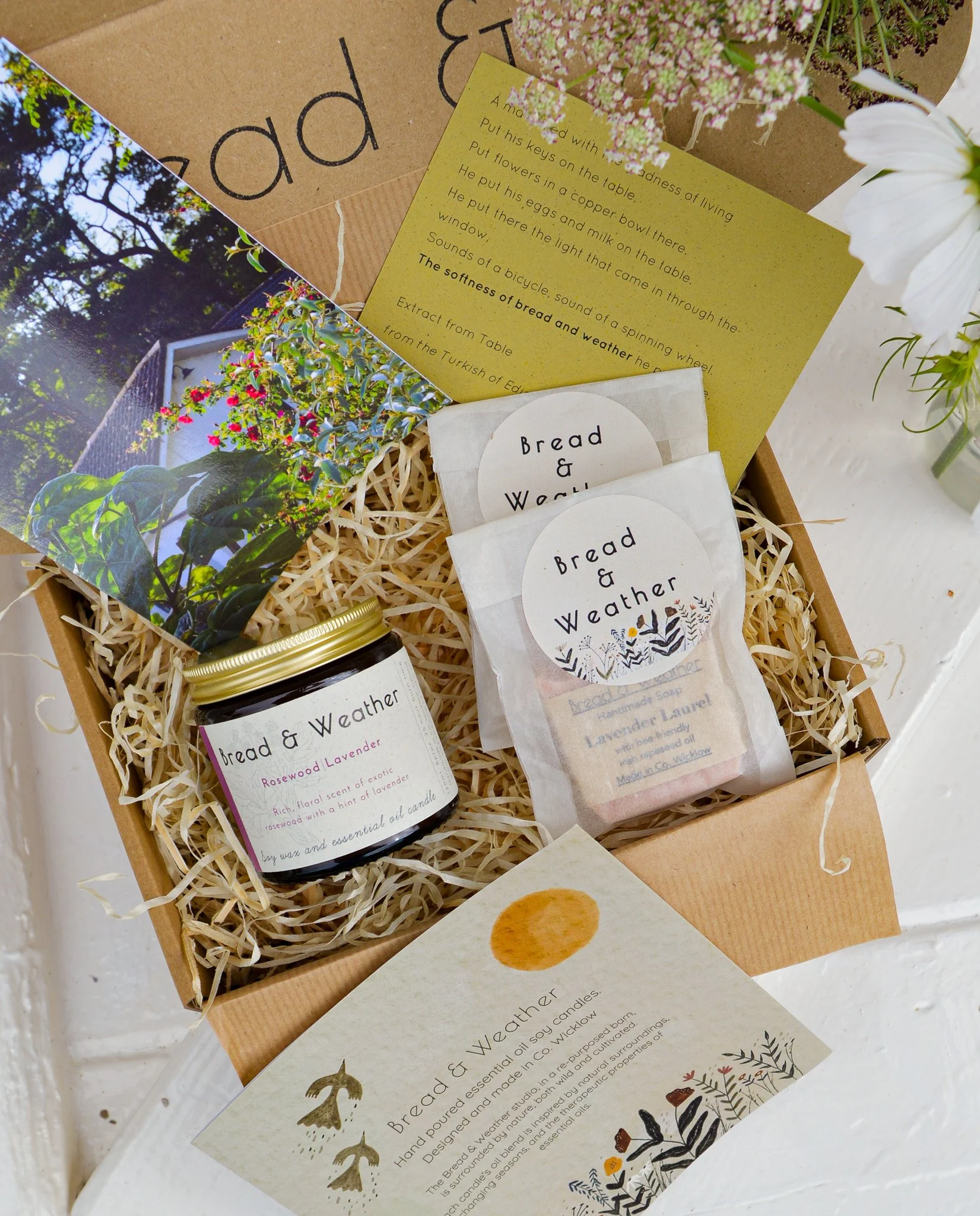 Each box also includes a small illustrated guide to the essential oils used in our studio, a printed excerpt from the poem Table that inspired the name Bread & Weather, and a picture postcard featuring the barn where your gift was made. Add a gift message or leave it blank for your own handwriting.